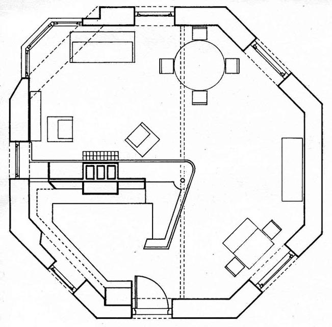 In de bestaande achthoekige plattegrond van deze molen is een 'meubel' gemaakt die de ruimte onderverdeeld in een keuken, eethoek en zitkamer, maar toch de gehele ruimte intact laat.