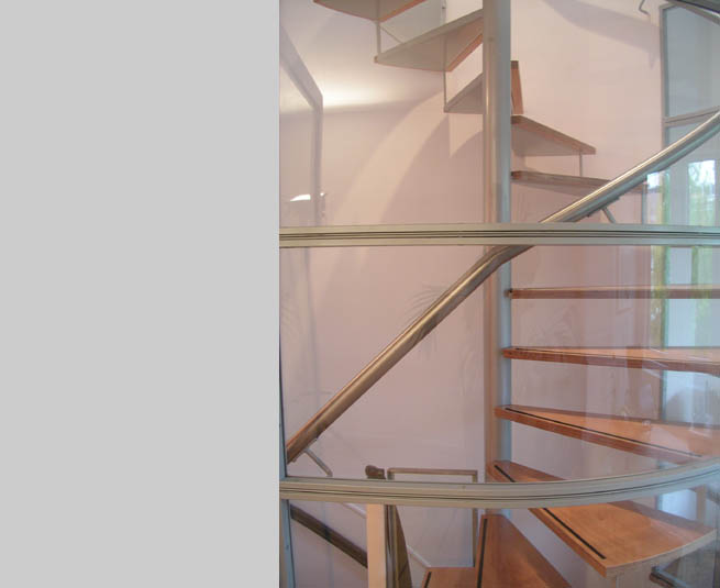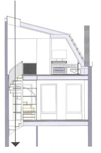 is het bovenste gedeelte van het trappenhuis gesloopt, en vervangen door een stalen wenteltrap, afgeschermd van de tweede etage middels een glazen pui. |